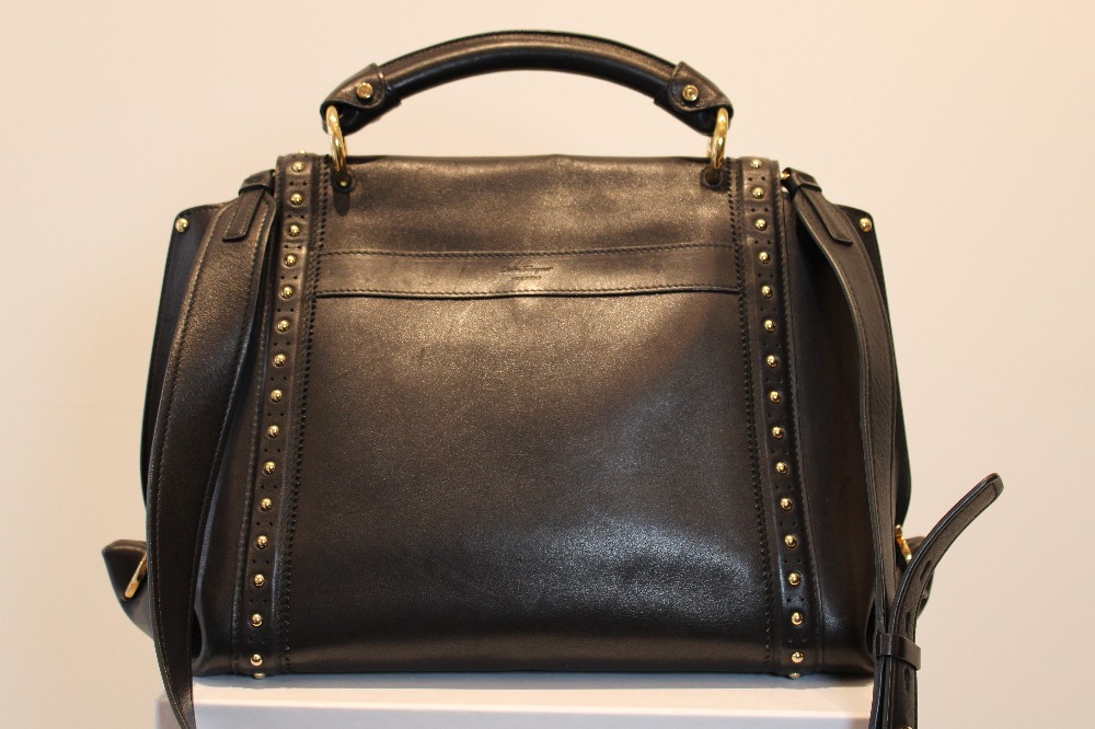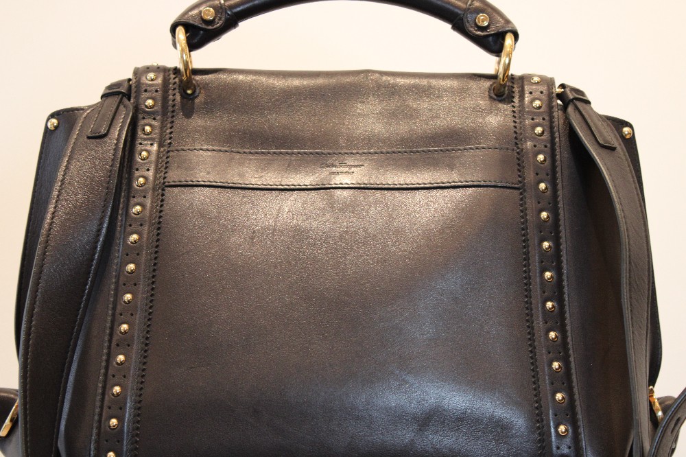 Black Salvatore Ferragamo Sofia leather bag. Features studded detailing and a Gancini clasp. Includes shoulder strap. Made in Italy. 10" x 12.8" x 6.7" Handle length 9.5" Strap length 47"