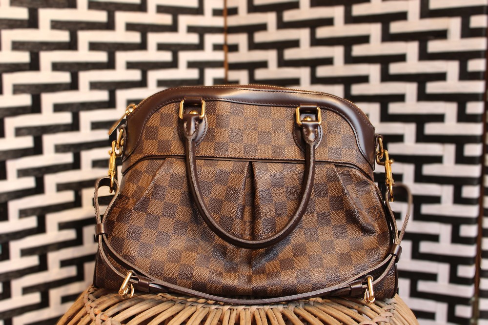 Base length: 13.25in. Height: 10.25in. Width: 5.5in. Handle drop: 5.25in. Detachable handle drop: 9.5in. Authentic Louis Vuitton 2008 Trevi PM two-way handbag. Signature Louis Vuitton checkerboard coated canvas in brown. Polished brass hardware. Brown cowhide leather trim and rolled top handles with an optional adjustable shoulder strap. Cherry red microfiber interior. Protective feet on case.
