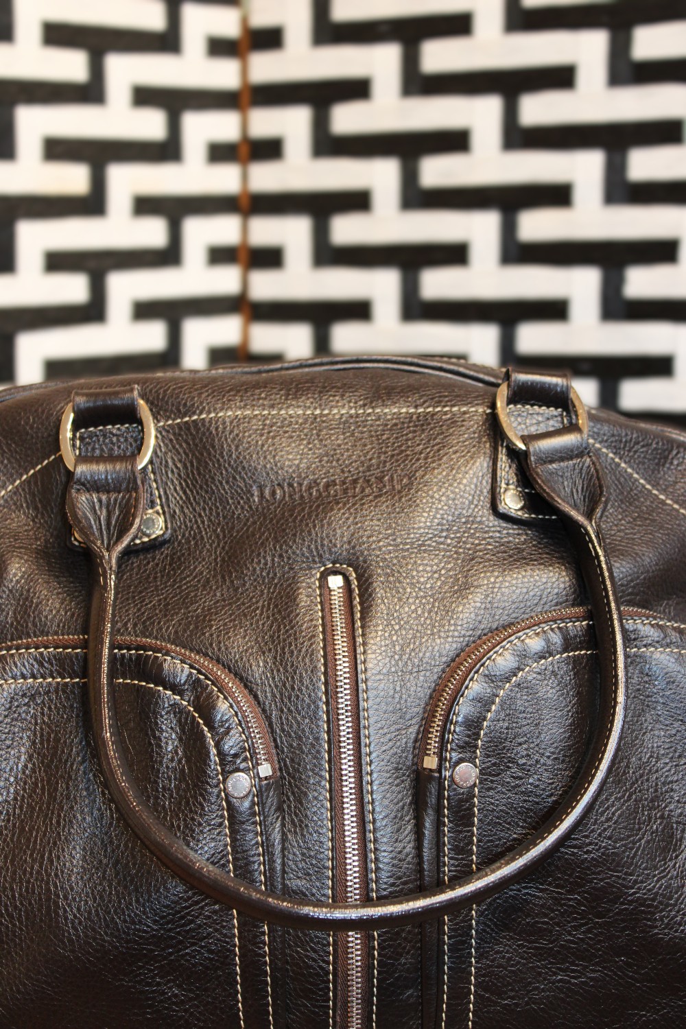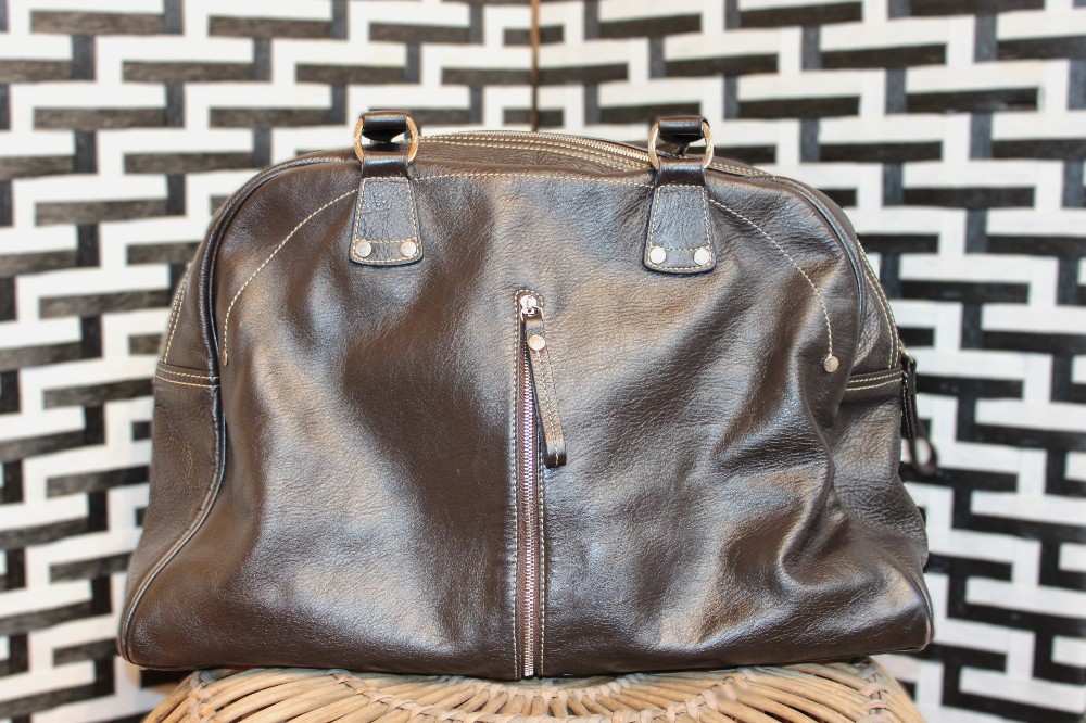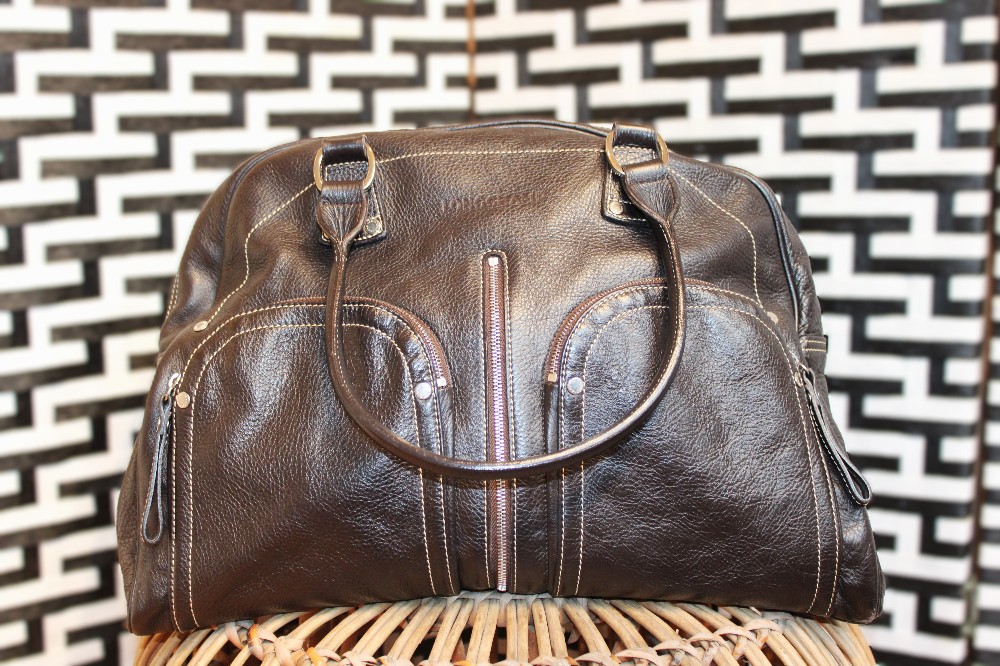 Pebbled brown leather shoulder bag. Silver-toned hardware with external zipper detailing, and two exterior zip pocket. Flat handles and dual shoulder straps. One large interior compartment with one internal zip pocket.