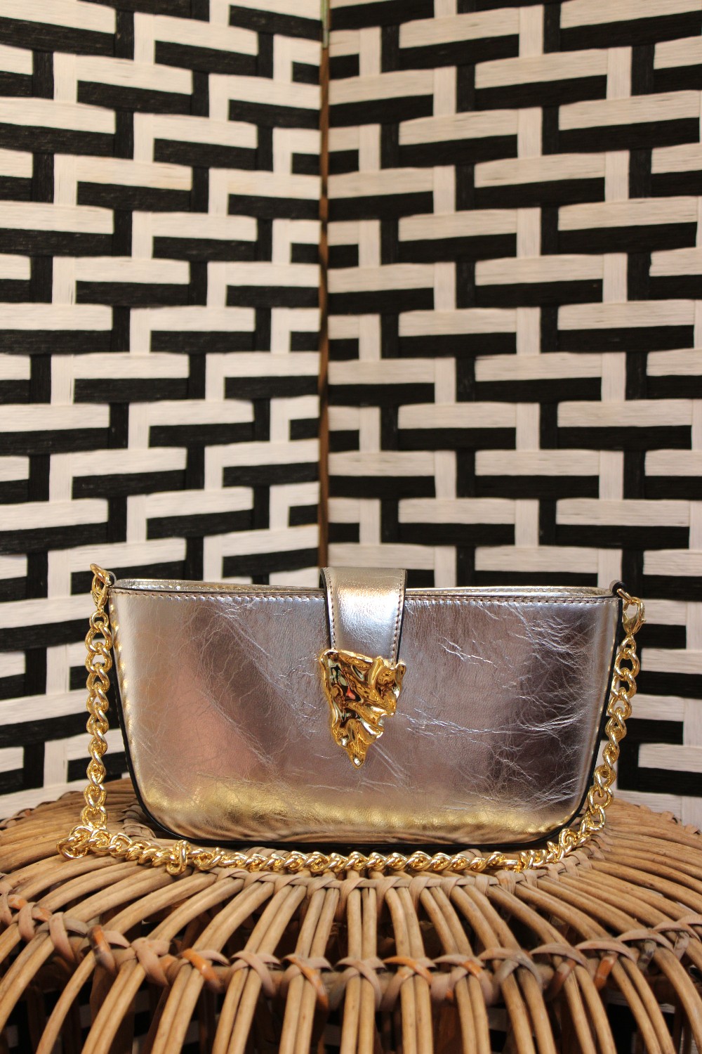 "The Crumple" crossbody bag. Metallic silver laminated goat high scratch-resistance Italian leather and brass. Detachable chain shoulder and detachable crossbody strap (22.5"L). Can be worn as a shoulder or crossbody bag. Frame top with lift-clasp closure. Center zip compartment divides interior. Lining: Suede microfiber Approx. 5.5"H x 11.8"W x 2"D