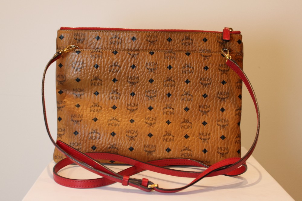 MCM Visetos camel leather monogram crossbody bag with red strap. Gold hardware. Red zipper detailing. One external slip pocket with snap closure. One interior slip pocket, one interior zip pocket, one main compartment.