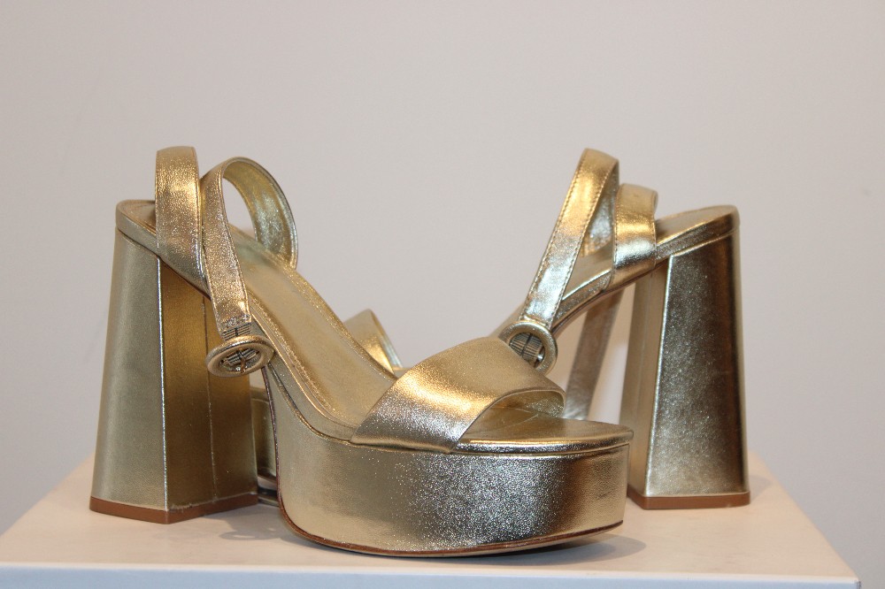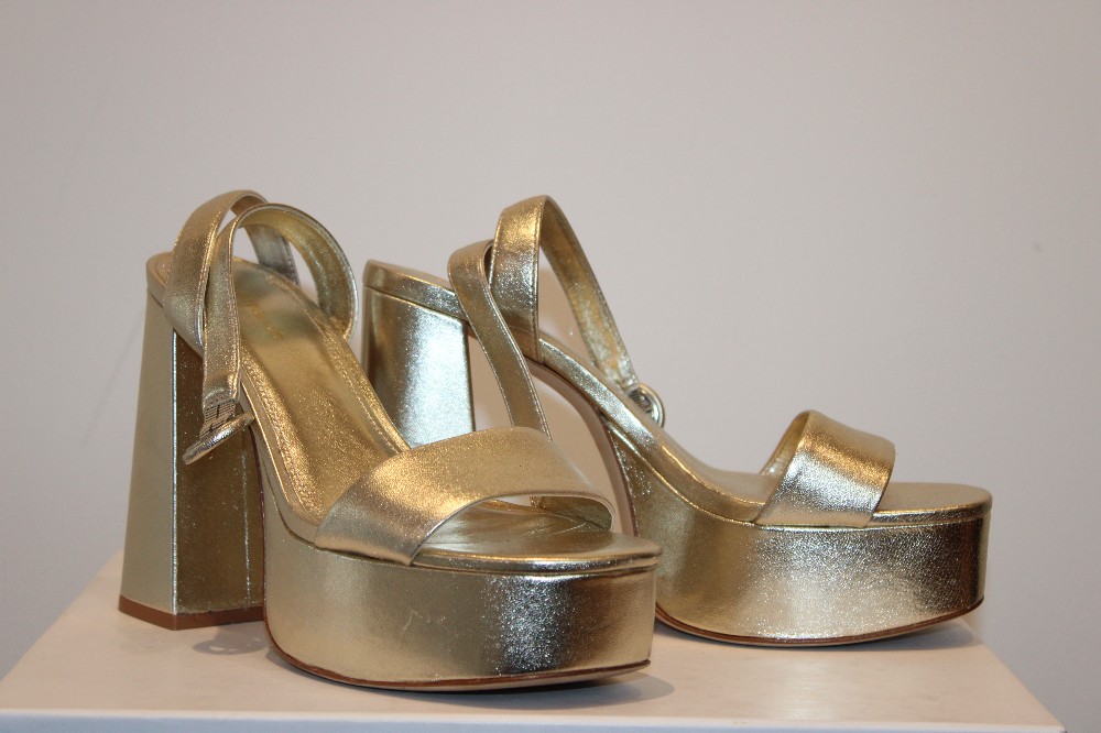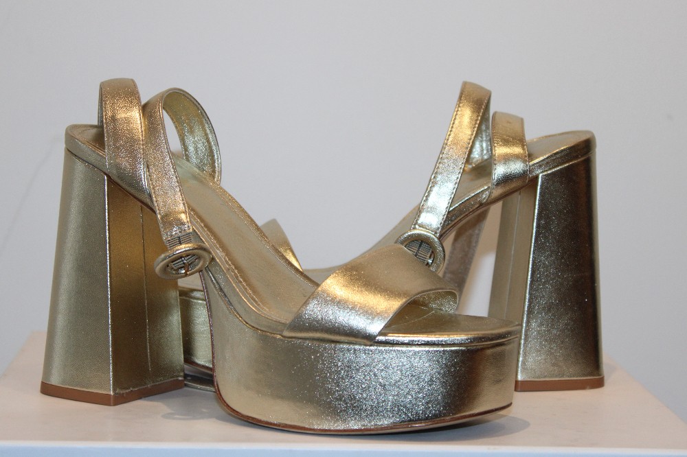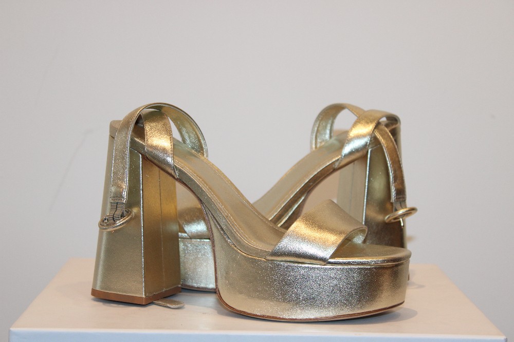 Open toe. Buckle ankle strap. 3" self-covered heel, 1" platform. Leather upper, lining, and sole. Made in Brazil. Size 7.