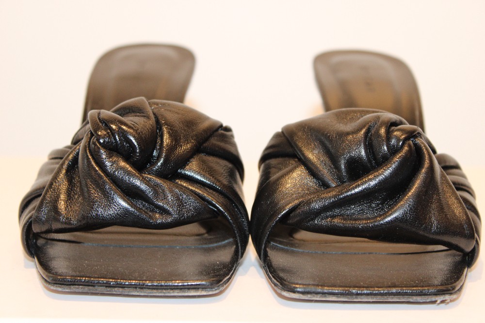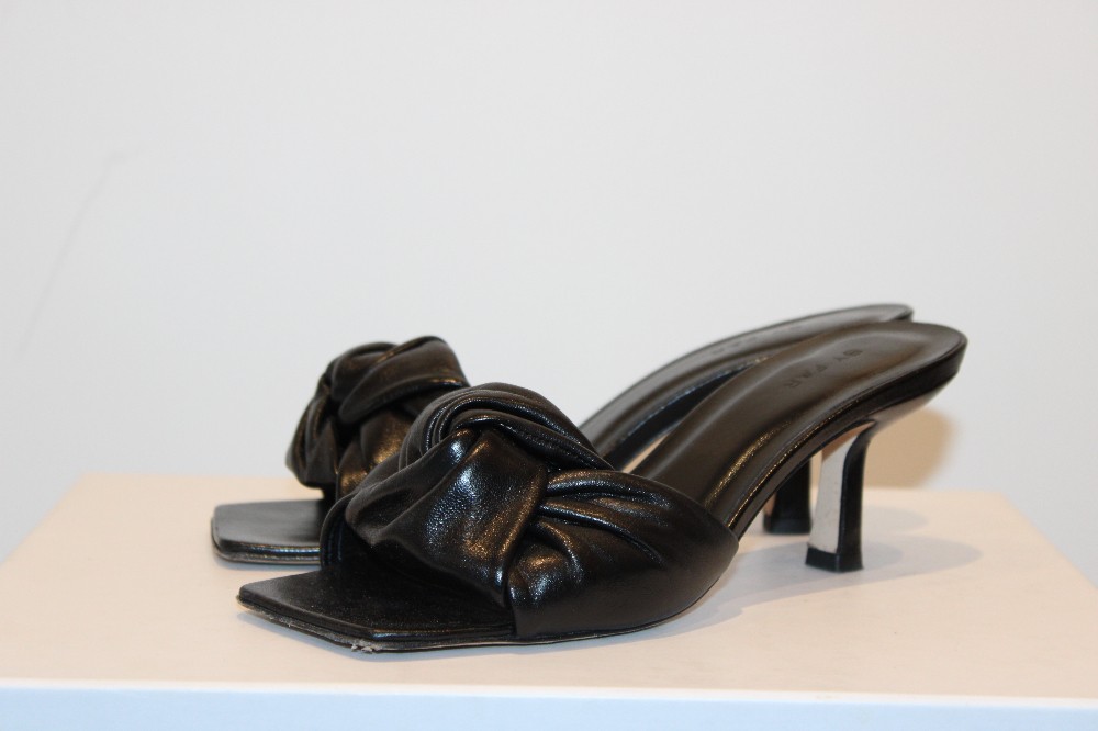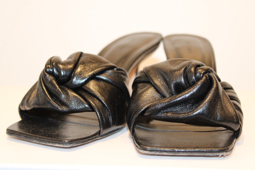 Black leather, open toe, square toe, slip-on mid-sculpted heel. Knot detailing on the front. 100% Leather.