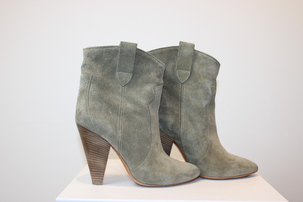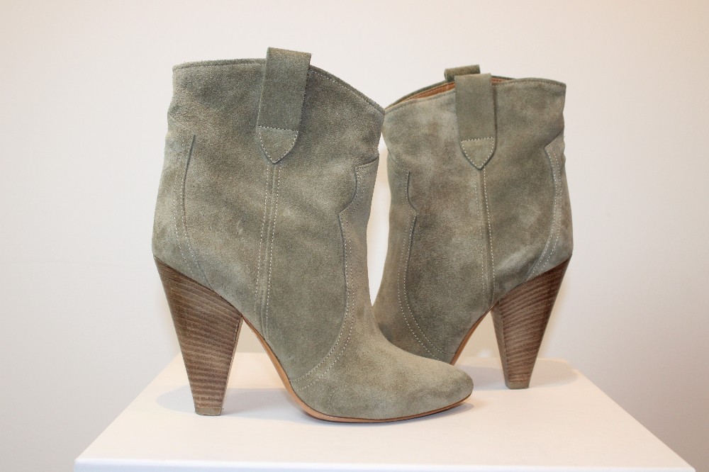 Isabel Marant Etoile suede bootie in moss. Cone-shaped stacked heel. Western style. Size 37. 4" heel.