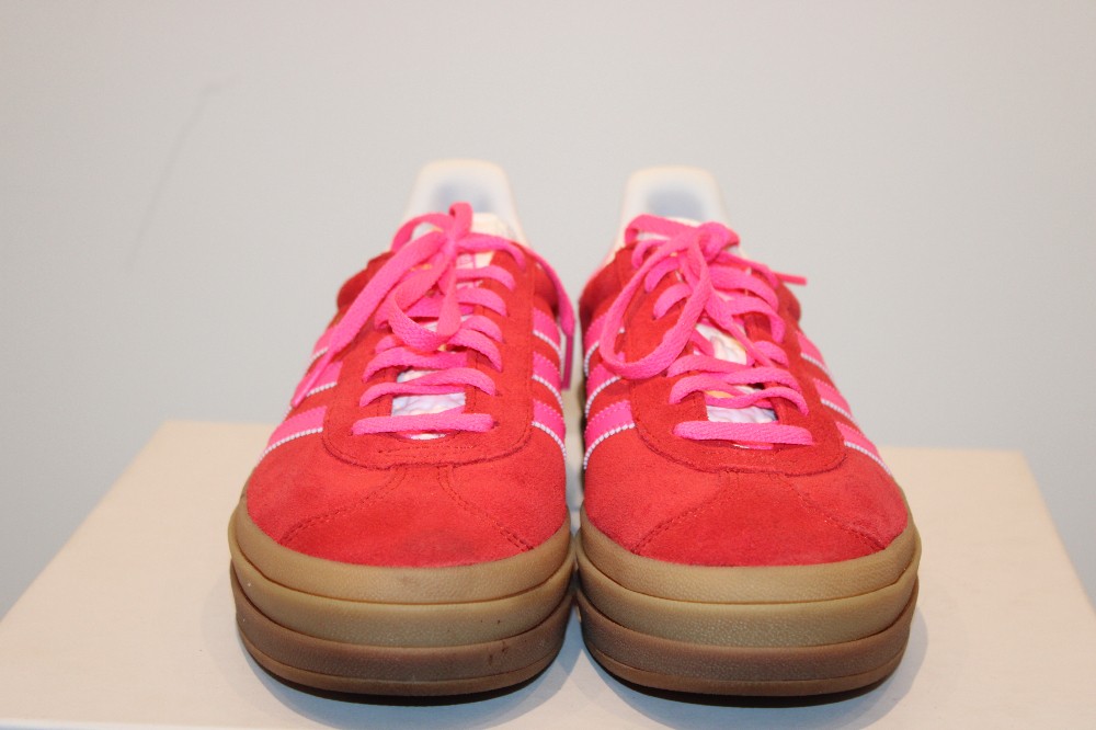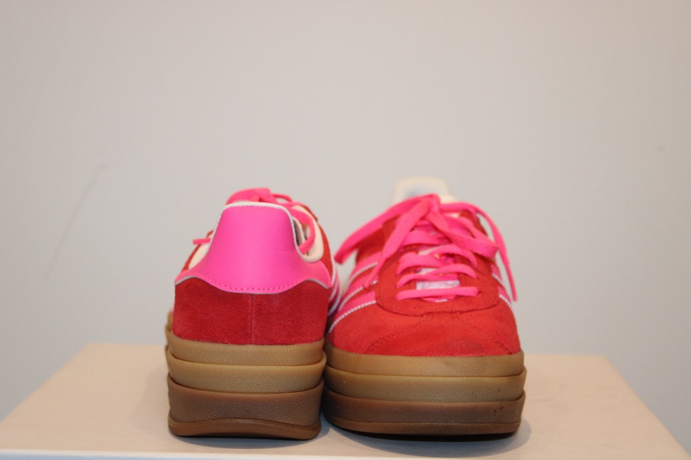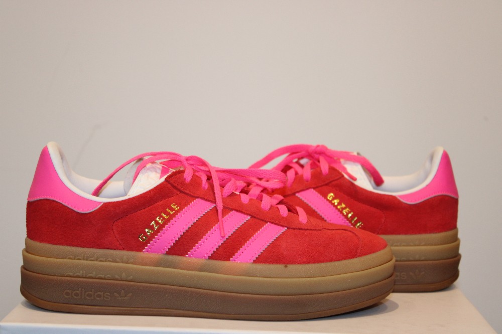 Adidas Gazelle Red with pink stripes Soft suede. Synthetic lining, three-layered stacked height. Metallic-gold "Gazelle" and iconic serrated 3-Stripes.
